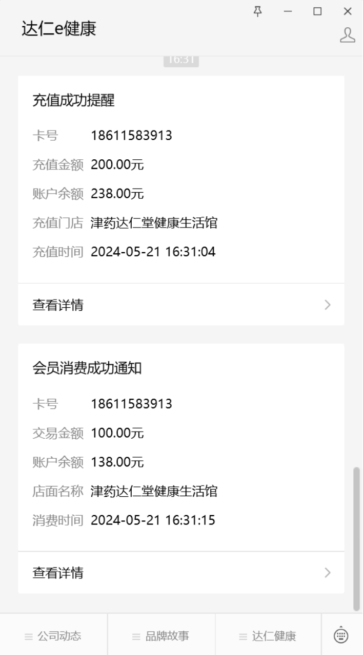 4、登录系统之后,充值、消费信息将通过“达仁e健康”自动推送给您