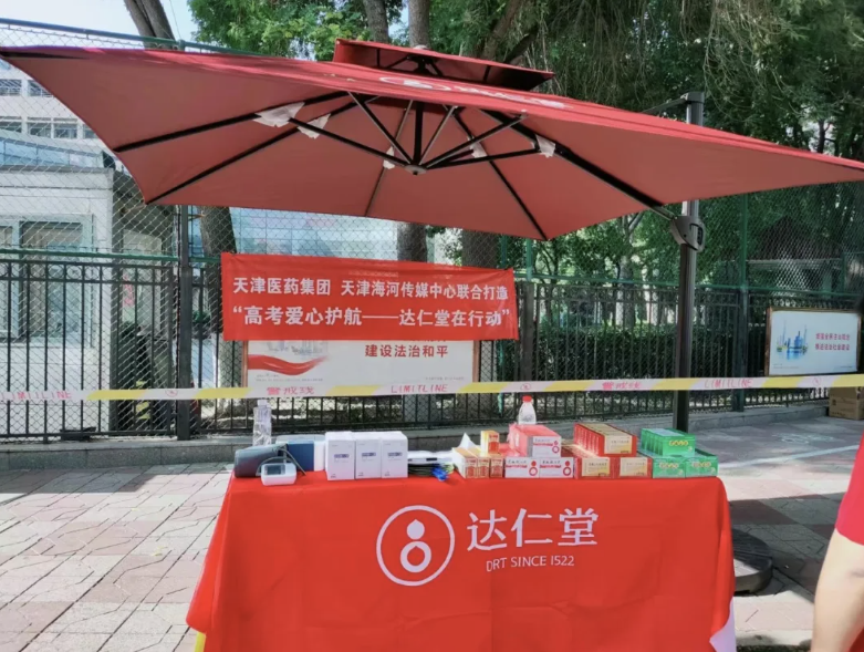 为了不影响考试当天考生及家长的备考状态,津药达仁堂的工作人员在高考前一天,奔赴市内六区连夜搭建爱心亭。